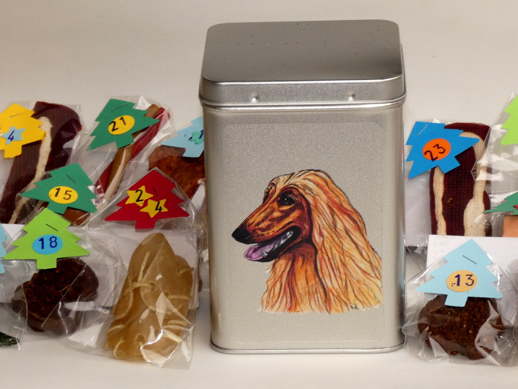 Netradiční adventní kalendář pro pejsky v dóze stříbrné barvy s víčkem na pantíky a s barevnou perokresbou afgánského chrta, kde jsou pamlsky uloženy ve 24 sáčcích označených čísly 1-24. Čísla jsou napsána na barevném kartonu ve tvaru vánočního stromečku, které jsou připevněny k celofánovému sáčku.