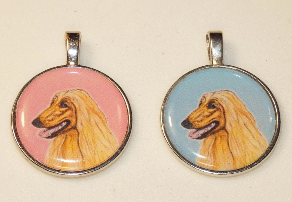 Barevná perokresba afgánského chrta s barevným pozadím je na bižuterním lůžku chráněna 3D epoxy pryskyřicí, která je nerozbitná a lehce pruží.