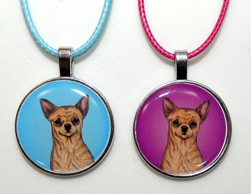 Barevná perokresba krátkosrsté čivavy (chihuahua) s barevným pozadím je na bižuterním lůžku chráněna 3D epoxy pryskyřicí, která je nerozbitná a lehce pruží.