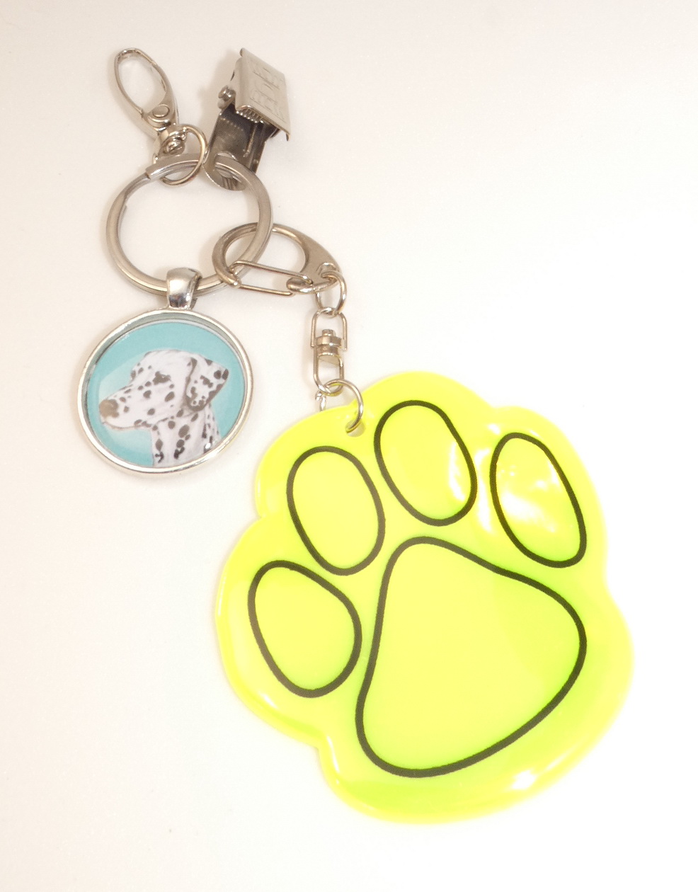Tlapka - kvalitní reflexní přívěsek z 3M scotchlite materiálu splňující EN 13356, na řetízku ve tvaru tlapky a s potiskem psí tlapky, rozměr 5 x 5 cm