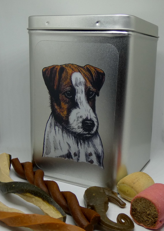 Netradiční balíček s pamlsky v plechové dóze s víčkem na pantíky a s perokresbou Jack Russel teriéra drsnosrstého.