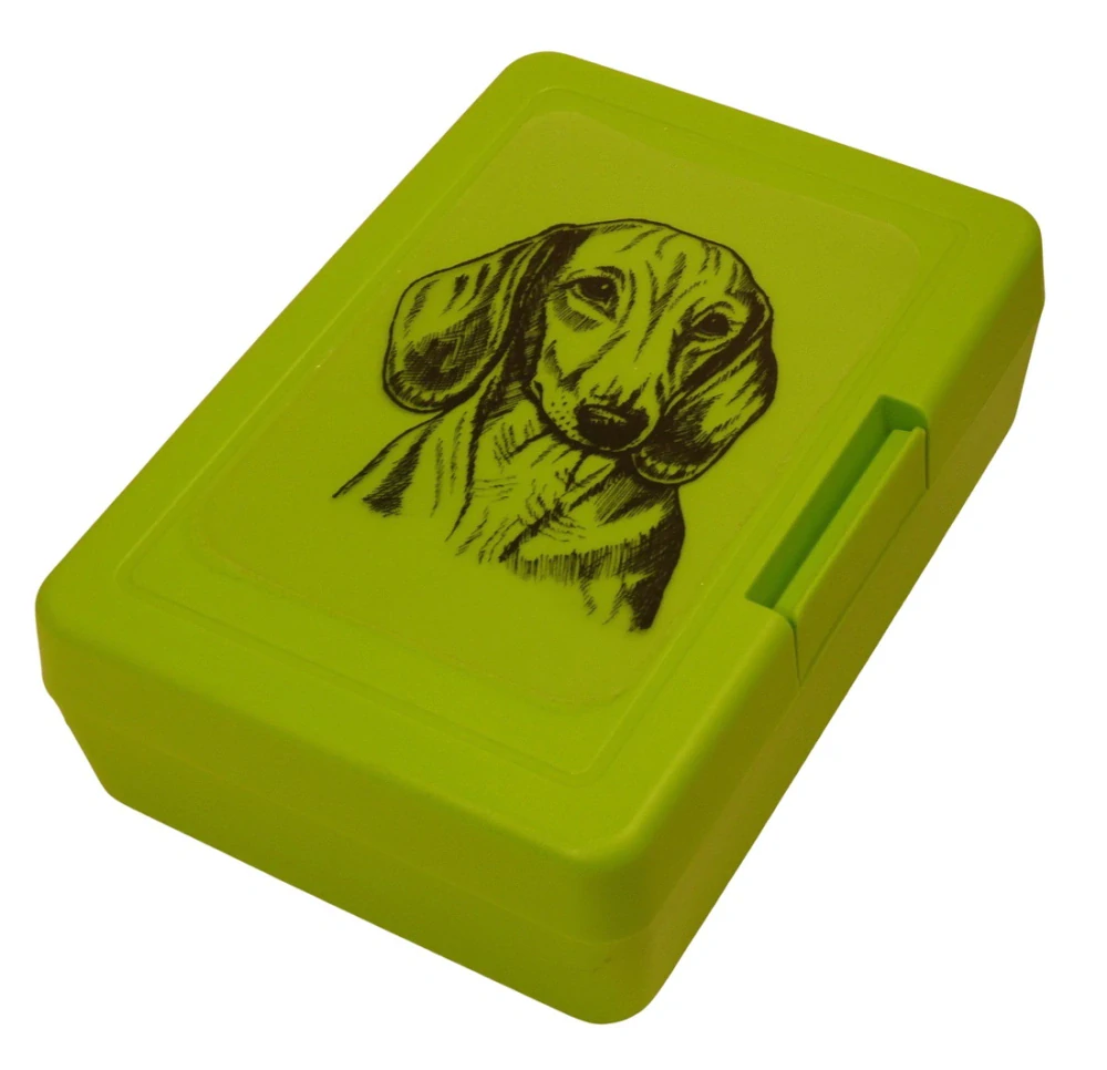 Svačinový box se vyrábí v Německu pod značkou Elasto Form KG z nezávadného plastu (BPA free) a je 100% recyklovatelný. Víčko je na pantíky, ve spodním díle jsou větrací otvory. Jezevčík je natištěn na velmi kvalitní čiré samolepce s matnou laminací.