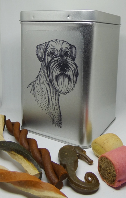 Netradiční dóza stříbrné barvy s několika druhy pamlsků pro pejsky s černobílou perokresbou knírače (Schnauzer), dóza má víčko na pantíky.
