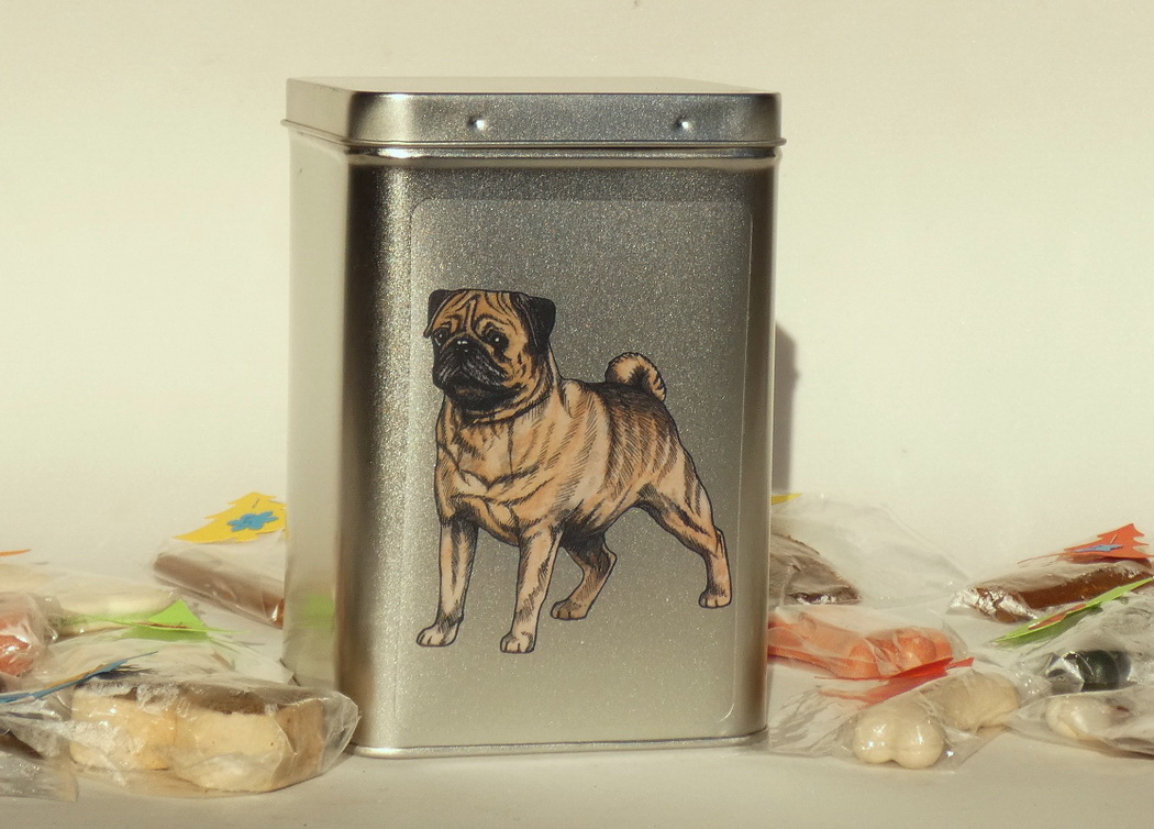 Netradiční adventní kalendář pro pejsky v dóze s barevnou perokresbou mopse, kde jsou pamlsky uloženy ve 24 mini sáčcích označených čísly 1-24. Čísla jsou napsána na barevném kartonu ve tvaru vánočního stromečku, které jsou připevněny k celofánovému sáčku..