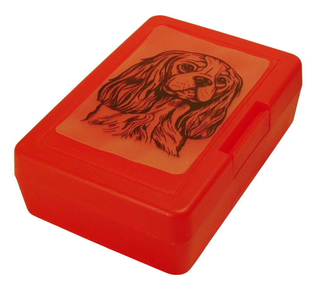 Plastový svačinový box s černobílým potiskem psa plemene Kavalír King Charles španěl. Vhodný k uložení nejen klasické svačiny, ale i dalších potravin jako např. sušeného ovoce a oříšků, sušenek a jiných dobrot. Svou velikostí je velmi vhodný dětem do školních aktovek a batohů, do školy i na výlety.