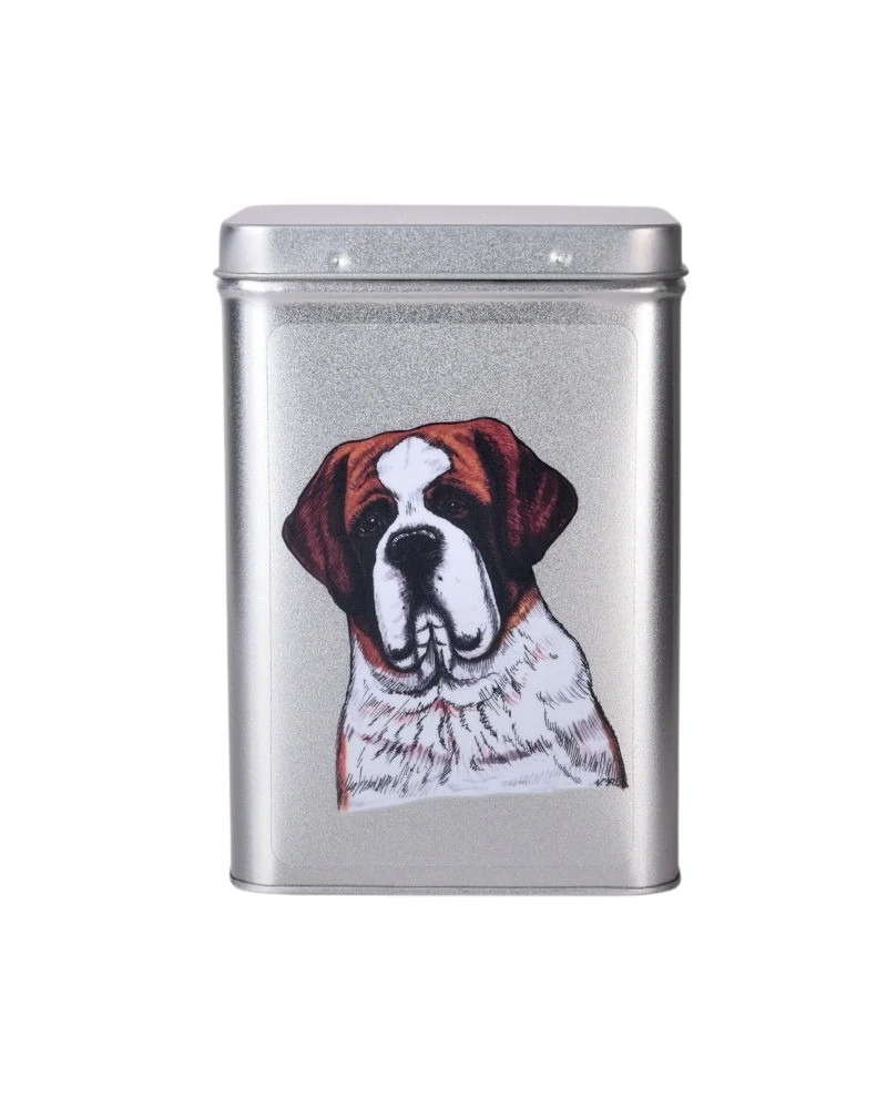 Plechová dóza s barevnou perokresbou svatobernardského psa. Dóza má stříbrnou barvu, víčko na pantíky a vnitřní prostor je určen pro cca 20-30 kusů balených pralinek, nebo pro tabulkové čokolády, ořechové tyčinky, či čaje, koření, sušenky. Také pro vánoční cukroví či pamlsky pro pejsky.