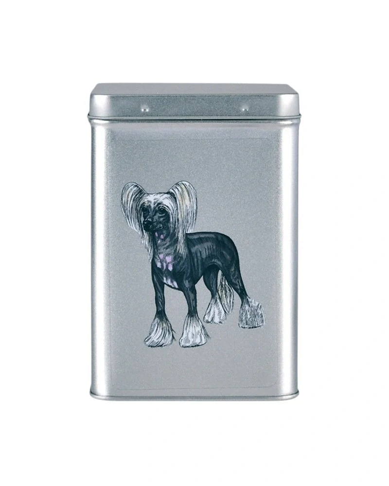 Plechová dóza stříbrné barvy s barevnou perokresbou psa plemene čínský chocholatý pes - forma osrstění naháč. Vnitřní prostor je určen pro 20 kusů balených pralinek, nebo pro malé tabulkové čokolády, 500 g sypaného čaje, ořechové tyčinky, či jiné cukrovinky. Také pro vánoční cukroví, perníčky či pamlsky pro pejsky, jako obal na dárek. Víčko je na panty.
