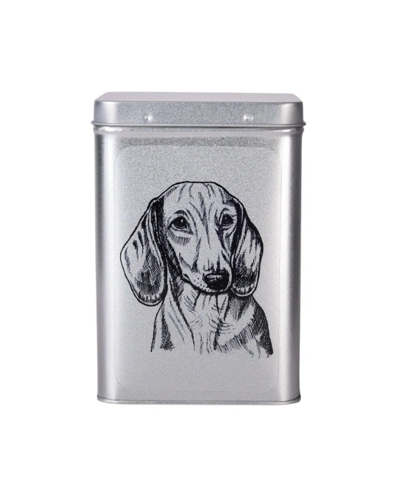 Plechová dóza stříbrné barvy, víčko je na pantíky, s perokresbou jezevčíka hladkosrstého. Vnitřní prostor je určen pro 20 - 30 kusů balených pralinek, nebo pro malé tabulkové čokolády, ořechové tyčinky, či jiné cukrovinky. Nebo pro vánoční cukroví, perníčky či pamlsky pro pejsky.