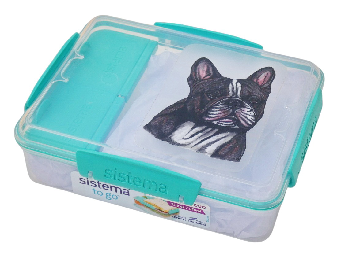 Novozélandská značka Sistema vyrábí svačinové boxy z nezávadného plastu, neobsahují ftaláty, ani BPA. Víčko se sundavá celé, k dóze jej spolehlivě přichytnou 4 plastové barevné klipy. Krabička je rozdělena na 3 části. Jedna větší část a 2 samostatné přihrádky s vlastními víčky v barvě klipu. Obrázek psích plemen je natištěn na velmi kvalitní čiré samolepce s matnou laminací. Box zatím nabízím v barvě klipu mint.