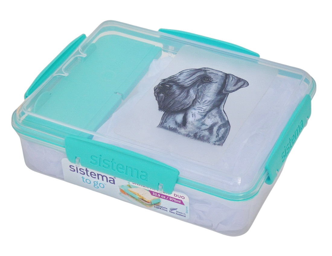 Novozélandská značka Sistema vyrábí svačinové boxy z nezávadného plastu, neobsahují ftaláty, ani BPA. Víčko se sundavá celé, k dóze jej spolehlivě přichytnou 4 plastové barevné klipy. Krabička je rozdělena na 3 části. Jedna větší část a 2 samostatné přihrádky s vlastními víčky v barvě klipu. Obrázek psích plemen je natištěn na velmi kvalitní čiré samolepce s matnou laminací. Box zatím nabízím v barvě klipu mint.