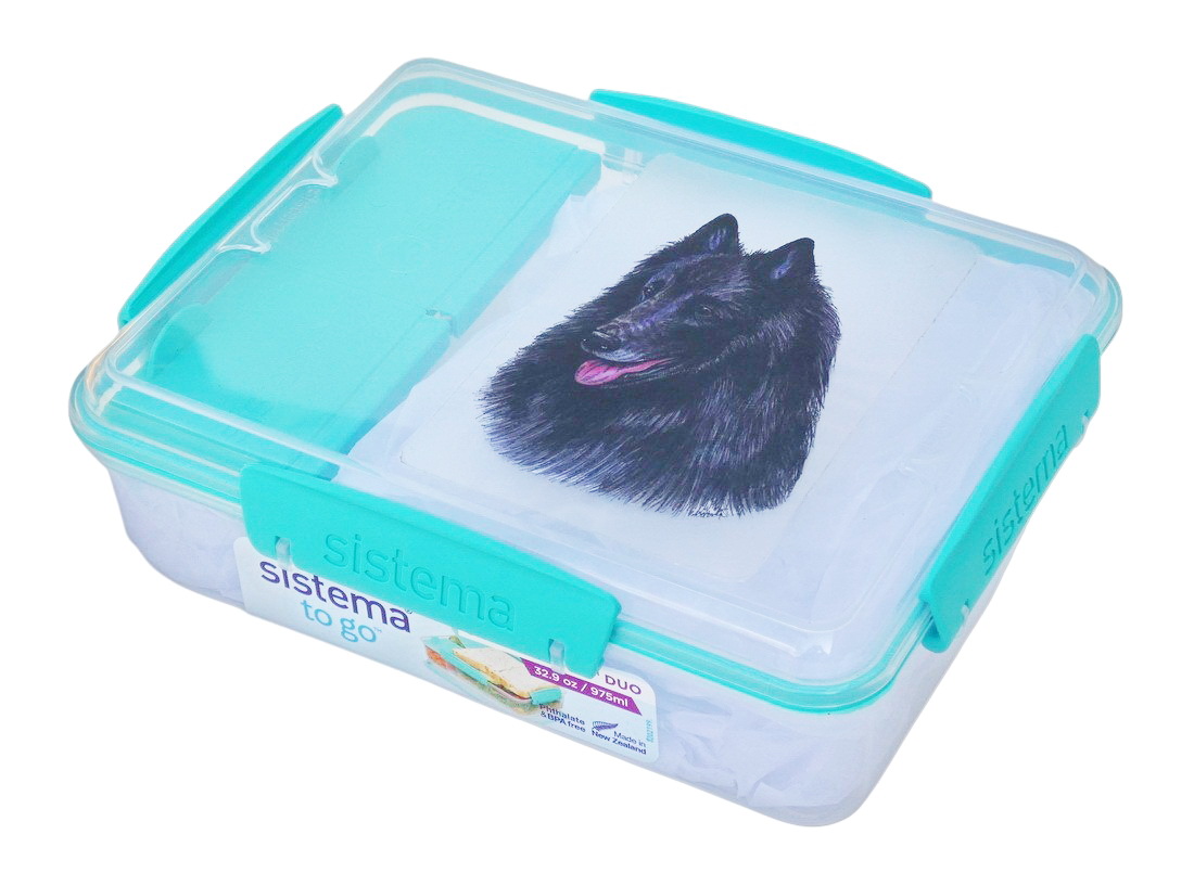 Novozélandská značka Sistema vyrábí svačinové boxy z nezávadného plastu, neobsahují ftaláty, ani BPA. Víčko se sundavá celé, k dóze jej spolehlivě přichytnou 4 plastové barevné klipy. Krabička je rozdělena na 3 části. Jedna větší část a 2 samostatné přihrádky s vlastními víčky v barvě klipu. Obrázek psích plemen je natištěn na velmi kvalitní čiré samolepce s matnou laminací. Box zatím nabízím v barvě klipu mint.