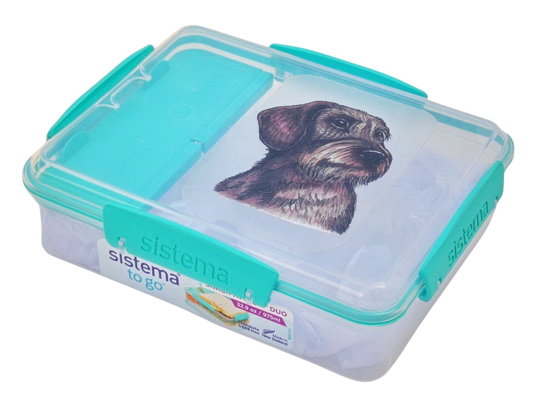 Novozélandská značka Sistema vyrábí svačinové boxy z nezávadného plastu, neobsahují ftaláty, ani BPA. Víčko se sundavá celé, k dóze jej spolehlivě přichytnou 4 plastové barevné klipy. Krabička je rozdělena na 3 části. Jedna větší část a 2 samostatné přihrádky s vlastními víčky v barvě klipu. Obrázek psích plemen je natištěn na velmi kvalitní čiré samolepce s matnou laminací. Box zatím nabízím v barvě klipu mint.