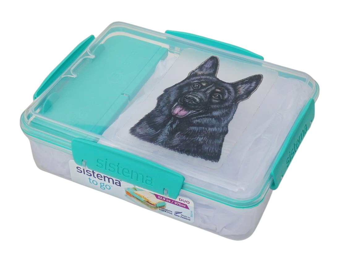 Novozélandská značka Sistema vyrábí svačinové boxy z nezávadného plastu, neobsahují ftaláty, ani BPA. Víčko se sundavá celé, k dóze jej spolehlivě přichytnou 4 plastové barevné klipy. Krabička je rozdělena na 3 části. Jedna větší část a 2 samostatné přihrádky s vlastními víčky v barvě klipu. Obrázek psích plemen je natištěn na velmi kvalitní čiré samolepce s matnou laminací. Box zatím nabízím v barvě klipu mint.