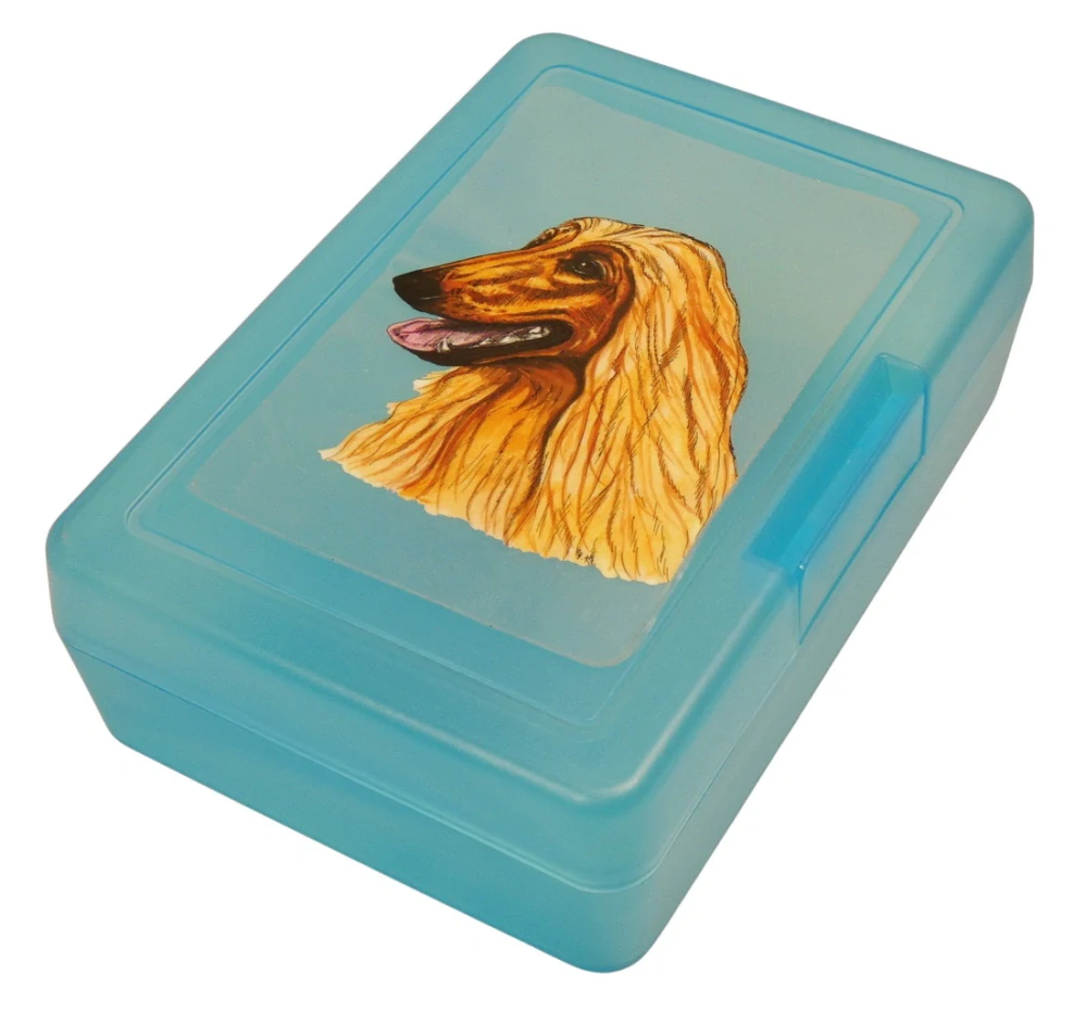 Plastový svačinový box s potiskem psa plemene afgánský chrt. Boxík je vhodný k uložení nejen klasické svačiny, ale i dalších potravin jako např. sušeného ovoce a oříšků, sušenek a jiných dobrot. Svou velikostí je velmi vhodný dětem do školních aktovek a batohů, do školy i na výlety.