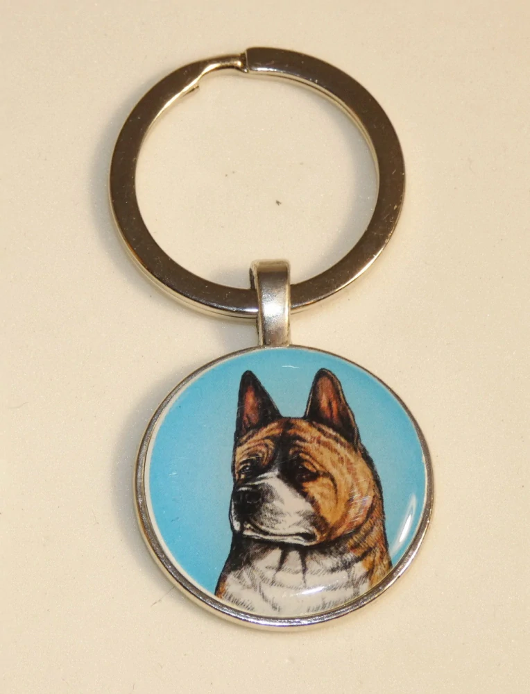 Barevná perokresba americké akity (velký japonský pes) s barevným pozadím je na bižuterním lůžku chráněna 3D epoxy pryskyřicí, která je nerozbitná a lehce pruží.