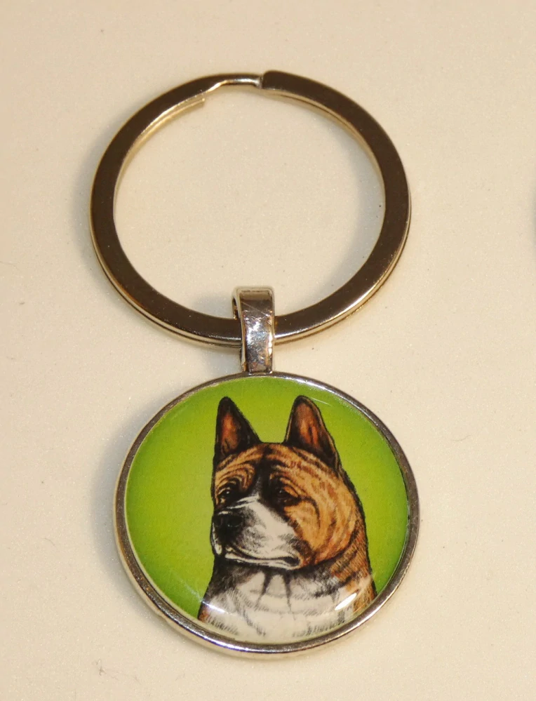Barevná perokresba americké akity (velký japonský pes) s barevným pozadím je na bižuterním lůžku chráněna 3D epoxy pryskyřicí, která je nerozbitná a lehce pruží.