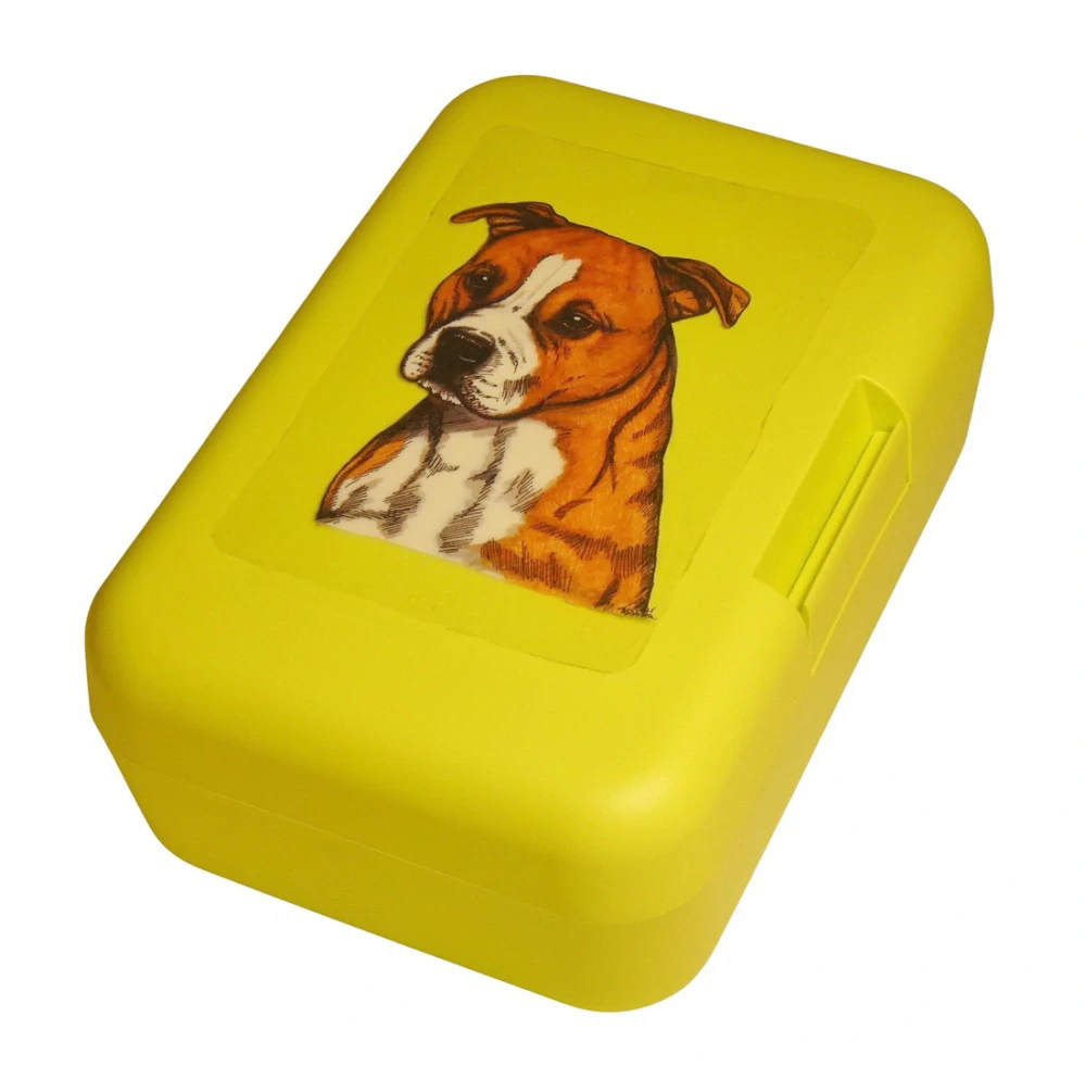 Plastový svačinový box s potiskem amerického stafordšírského teriéra. Boxík je vhodný k uložení nejen klasické svačiny, ale i dalších potravin jako např. sušeného ovoce a oříšků, sušenek a jiných dobrot. Svou velikostí je velmi vhodný dětem do školních aktovek a batohů, do školy i na výlety.