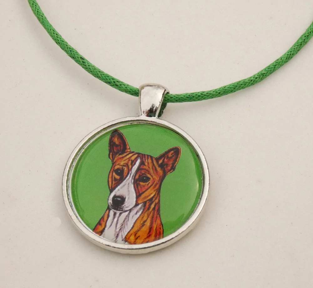 Barevná perokresba pejska plemene basenji s barevným pozadím je na bižuterním lůžku chráněna 3D epoxy pryskyřicí, která je nerozbitná a lehce pruží.