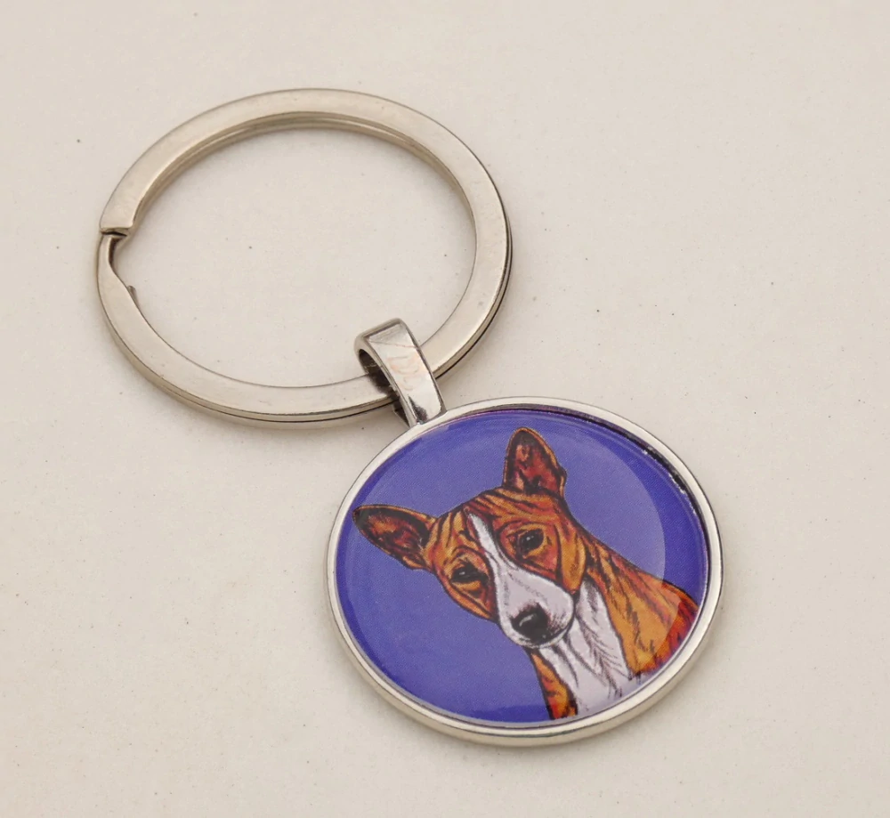 Barevná perokresba pejska plemene basenji s barevným pozadím je na bižuterním lůžku chráněna 3D epoxy pryskyřicí, která je nerozbitná a lehce pruží.