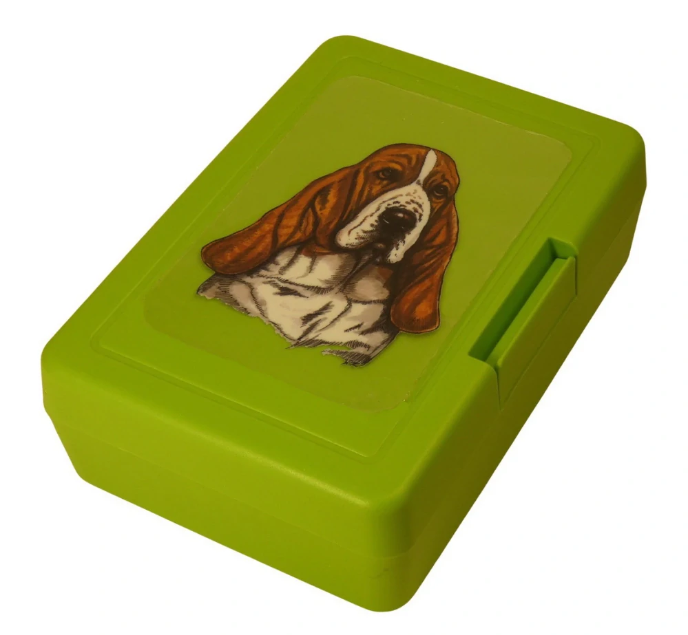 Plastový svačinový box s barevným potiskem baseta. Boxík je vhodný k uložení nejen klasické svačiny, ale i dalších potravin jako např. sušeného ovoce a oříšků, sušenek a jiných dobrot. Svou velikostí je velmi vhodný dětem do školních aktovek a batohů, do školy i na výlety.
