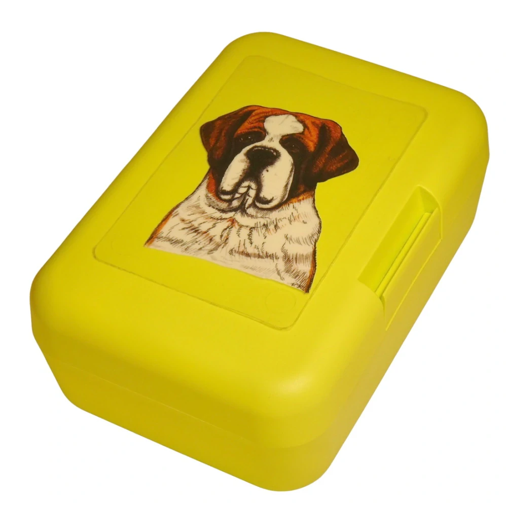 Plastový svačinový box s potiskem svatobernardského psa. Boxík je vhodný k uložení nejen klasické svačiny, ale i dalších potravin jako např. sušeného ovoce a oříšků, sušenek a jiných dobrot. Svou velikostí je velmi vhodný dětem do školních aktovek a batohů, do školy i na výlety.