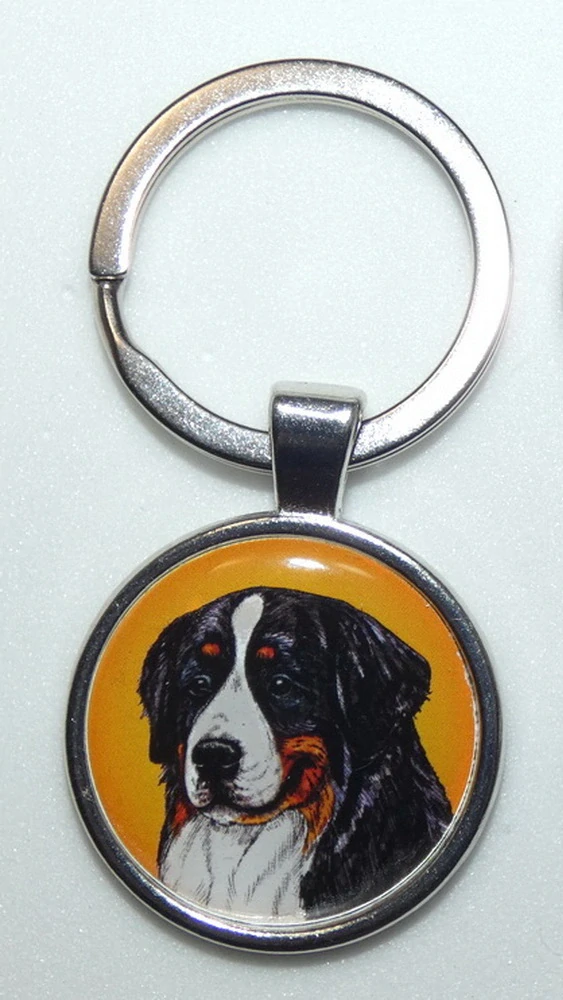 Barevná perokresba bernského salašnického psa s barevným pozadím je na bižuterním lůžku chráněna 3D epoxy pryskyřicí, která je nerozbitná a lehce pruží.