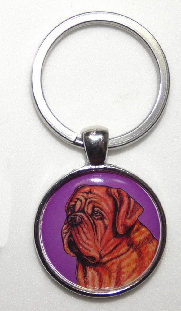 Barevná perokresba psa plemene bordeauxská doga s barevným pozadím je na bižuterním lůžku chráněna 3D epoxy pryskyřicí, která je nerozbitná a lehce pruží.