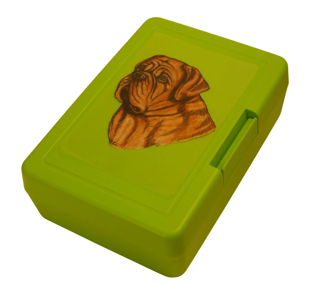 Plastový svačinový box s barevným potiskem bordeauxské dogy. Vhodný k uložení nejen klasické svačiny, ale i dalších potravin jako např. sušeného ovoce a oříšků, sušenek a jiných dobrot. Svou velikostí je velmi vhodný dětem do školních aktovek a batohů, do školy i na výlety.