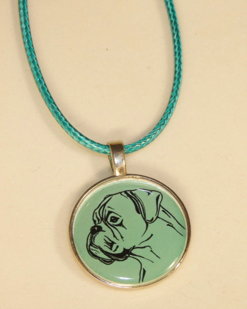 Černobílá perokresba boxera s barevným pozadím je na bižuterním lůžku chráněna 3D epoxy pryskyřicí, která je nerozbitná a lehce pruží.