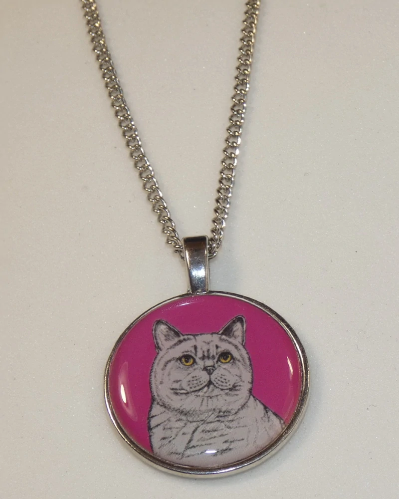 Černobílá perokresba britské kočky s barevným pozadím je na bižuterním lůžku chráněna 3D epoxy pryskyřicí, která je nerozbitná a lehce pruží.