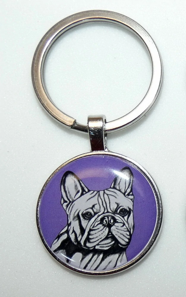 Černobílá perokresba francouzského buldočka s barevným pozadím je na bižuterním lůžku chráněna 3D epoxy pryskyřicí, která je nerozbitná a lehce pruží.