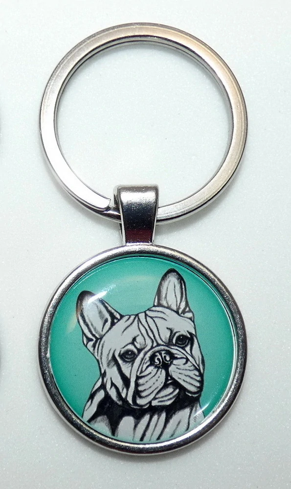 Černobílá perokresba francouzského buldočka s barevným pozadím je na bižuterním lůžku chráněna 3D epoxy pryskyřicí, která je nerozbitná a lehce pruží.