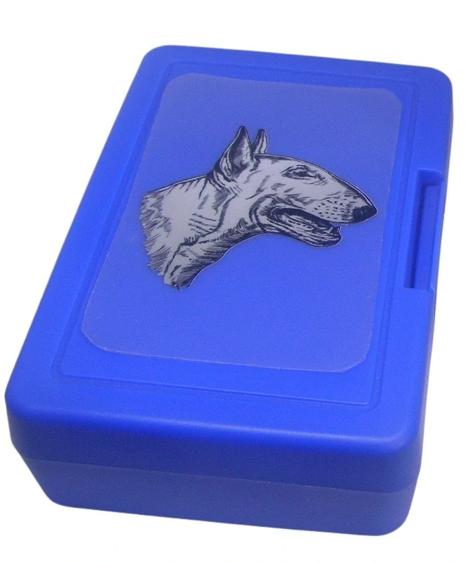 Plastový svačinový box s potiskem bulteriéra (Bull Terrier). Vhodný k uložení nejen klasické svačiny, ale i dalších potravin jako např. sušeného ovoce a oříšků, sušenek a jiných dobrot. Svou velikostí je velmi vhodný dětem do školních aktovek a batohů, do školy i na výlety.