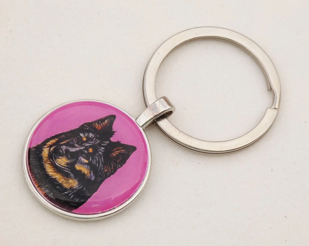 Barevná perokresba chodského psa s barevným pozadím je na bižuterním lůžku chráněna 3D epoxy pryskyřicí, která je nerozbitná a lehce pruží.
