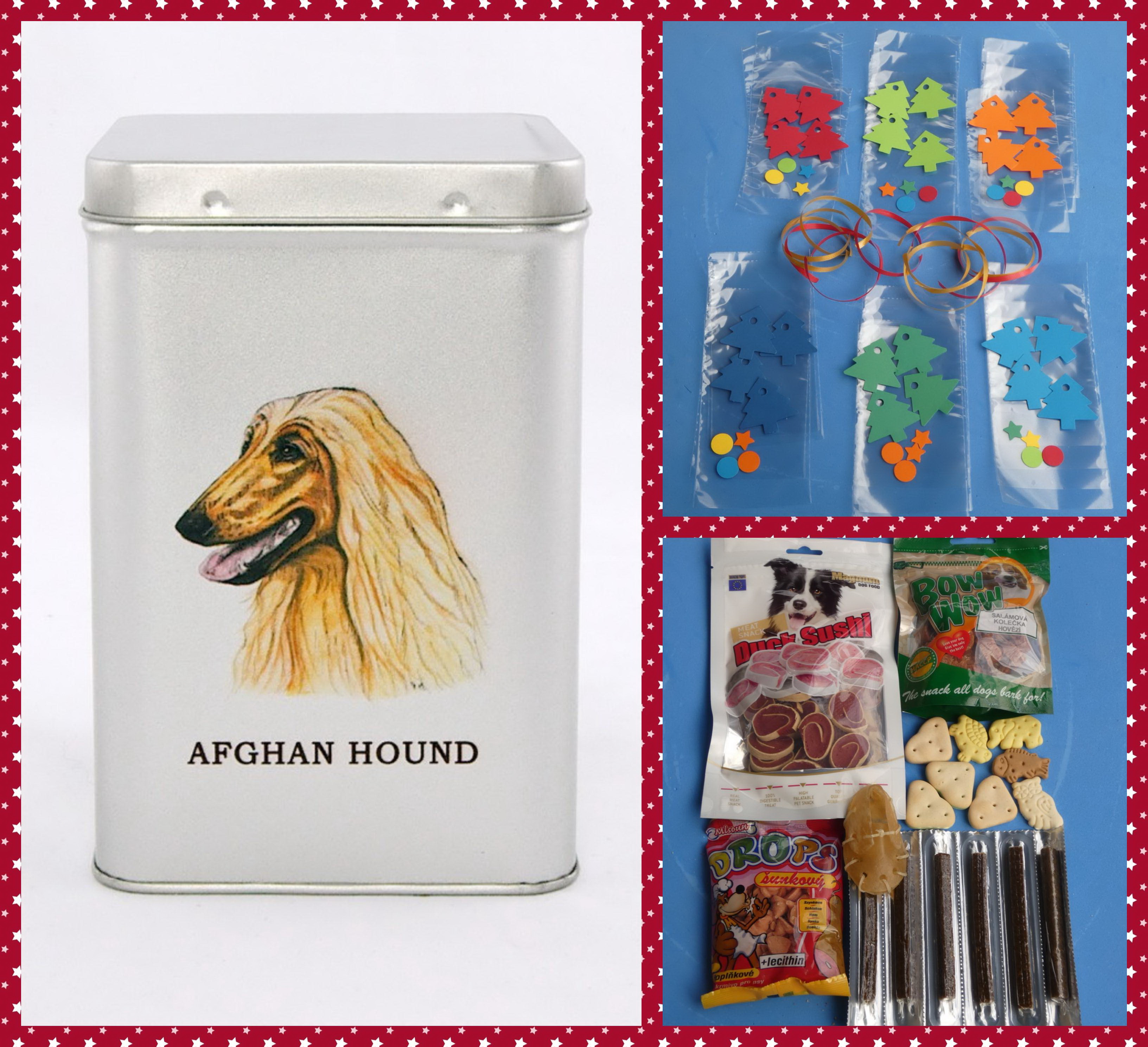 DIY - vyrobte si sami netradiční adventní kalendář pro pejsky z dodaných pamlsků, sáčků, stuh a papírových stromečků. Vše pak můžete uložit do dózy stříbrné barvy s víčkem na pantíky a s barevnou perokresbou afgánského chrta.