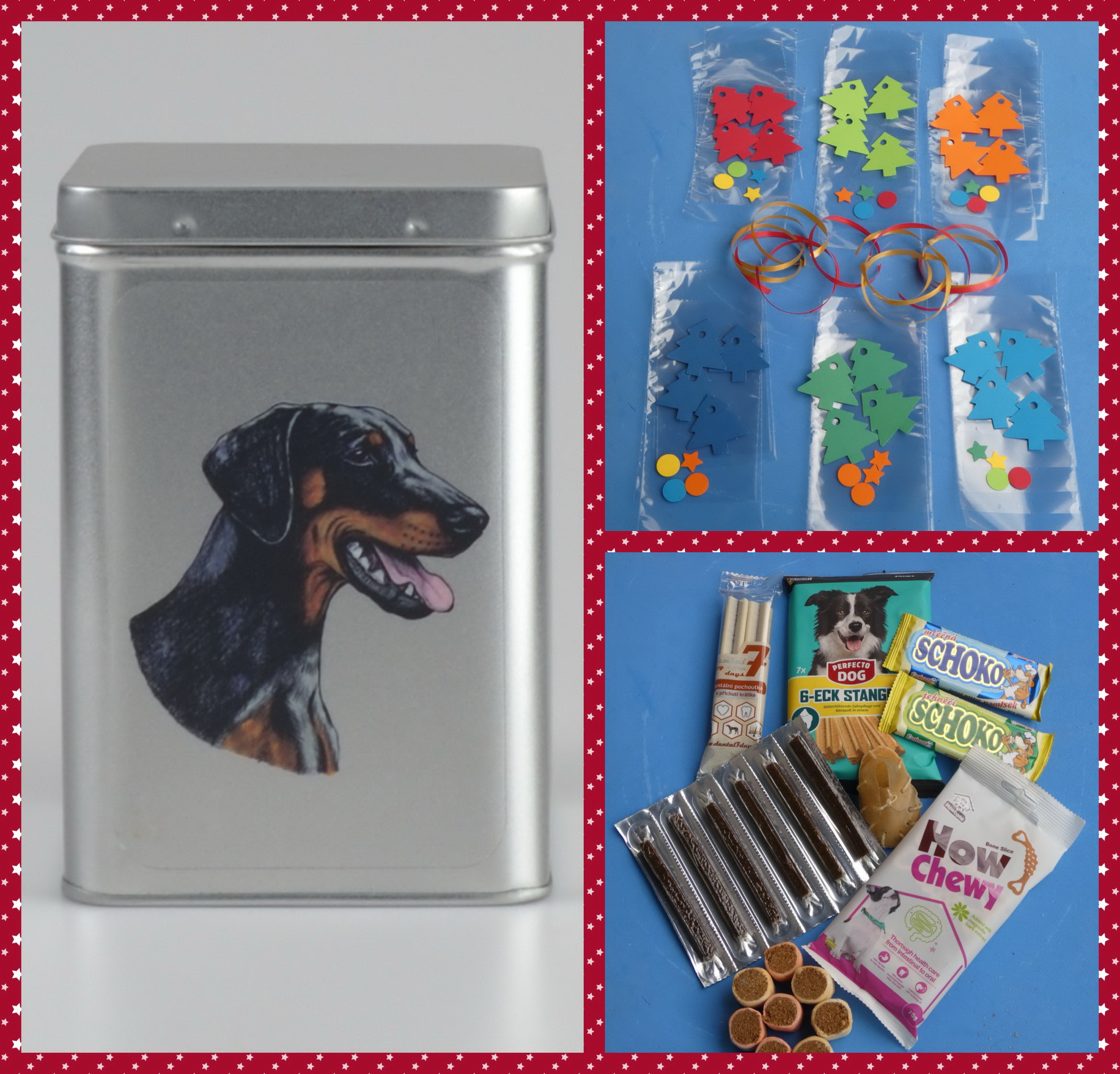 DIY - vyrobte si sami netradiční adventní kalendář pro pejsky z dodaných pamlsků, sáčků, stuh a papírových stromečků. Vše pak můžete uložit do dózy stříbrné barvy s víčkem na pantíky a s barevnou perokresbou dobrmana.