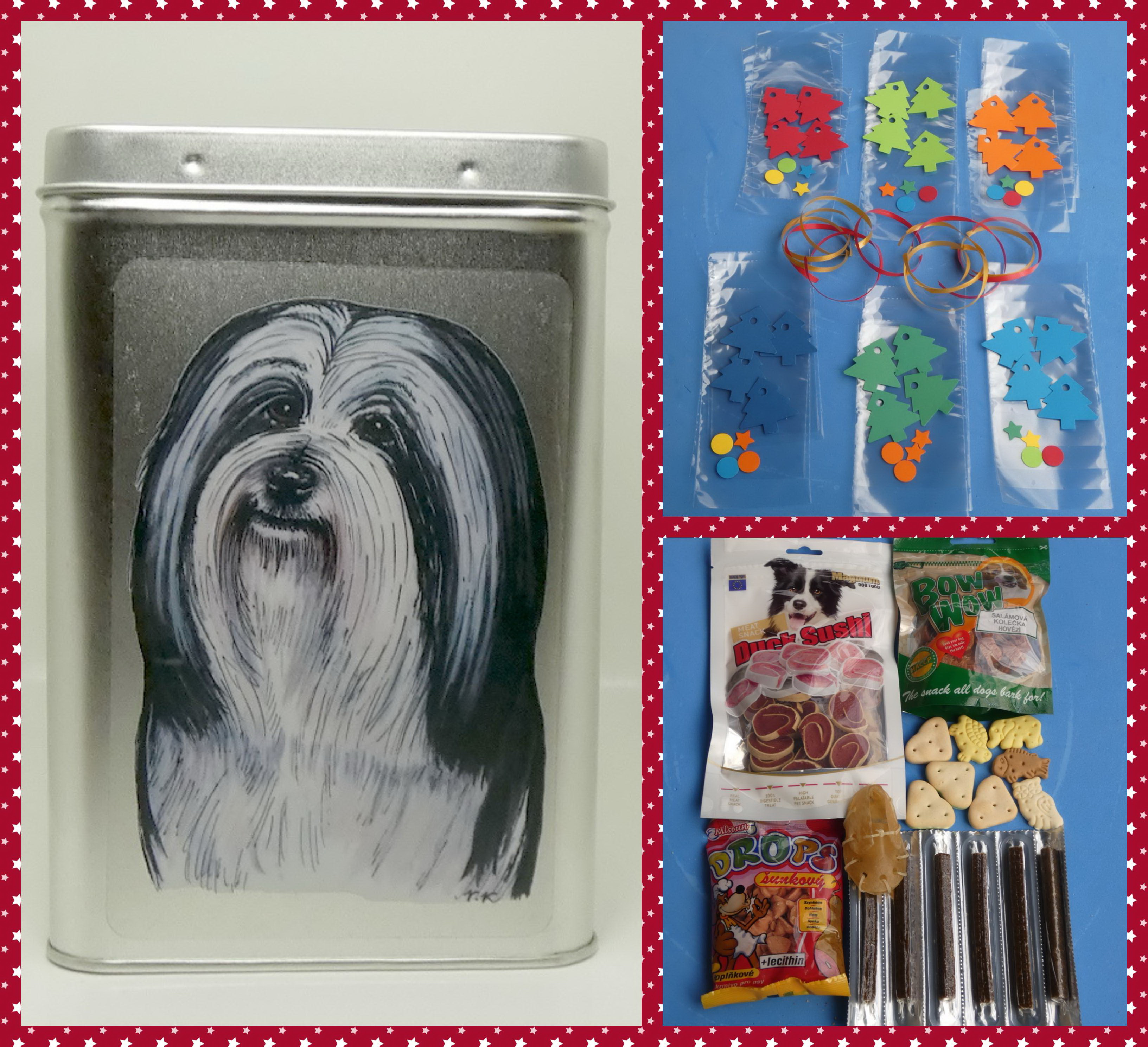 DIY - vyrobte si sami netradiční adventní kalendář pro pejsky z dodaných pamlsků, sáčků, stuh a papírových stromečků. Vše pak můžete uložit do dózy stříbrné barvy s víčkem na pantíky a s barevnou perokresbou havanského psíka.