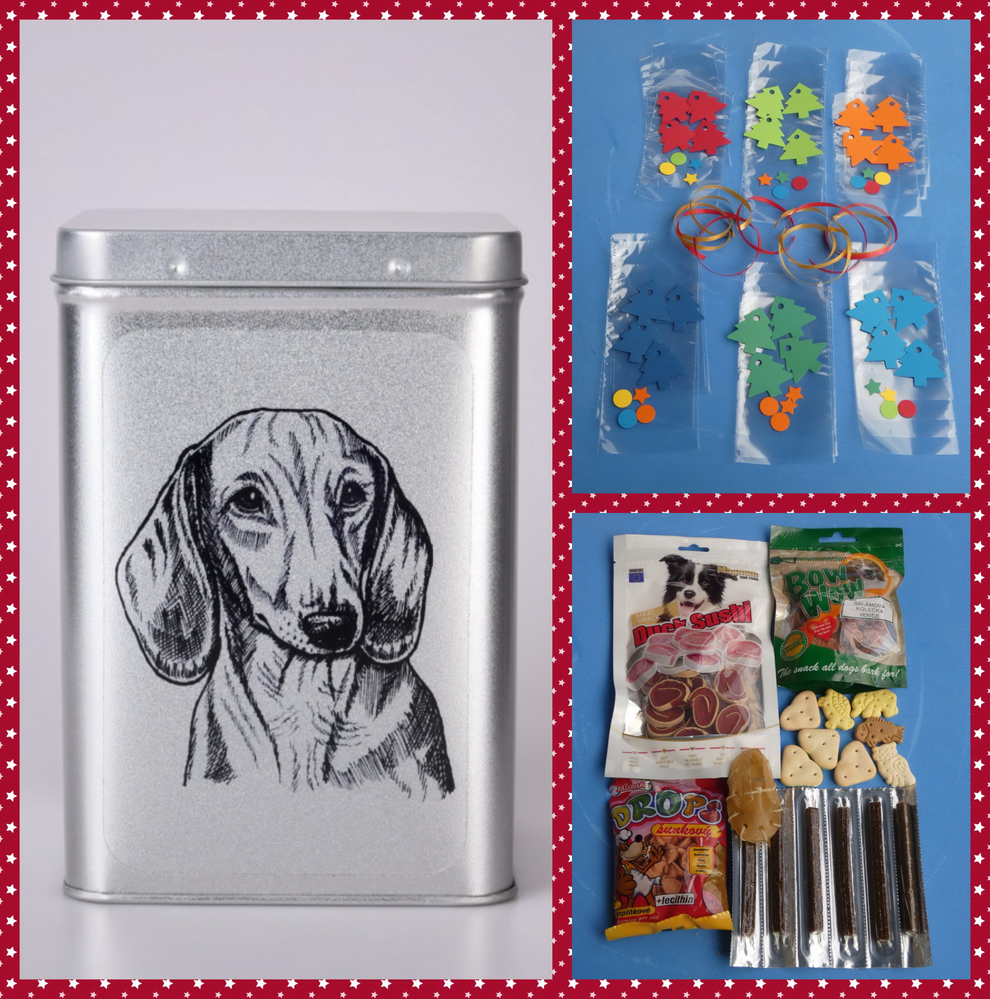 DIY - vyrobte si sami netradiční adventní kalendář pro pejsky z dodaných pamlsků, sáčků, stuh a papírových stromečků. Vše pak můžete uložit do dózy stříbrné barvy s víčkem na pantíky a s černobílou perokresbou krátkosrstého jezevčíka (Dachshund)