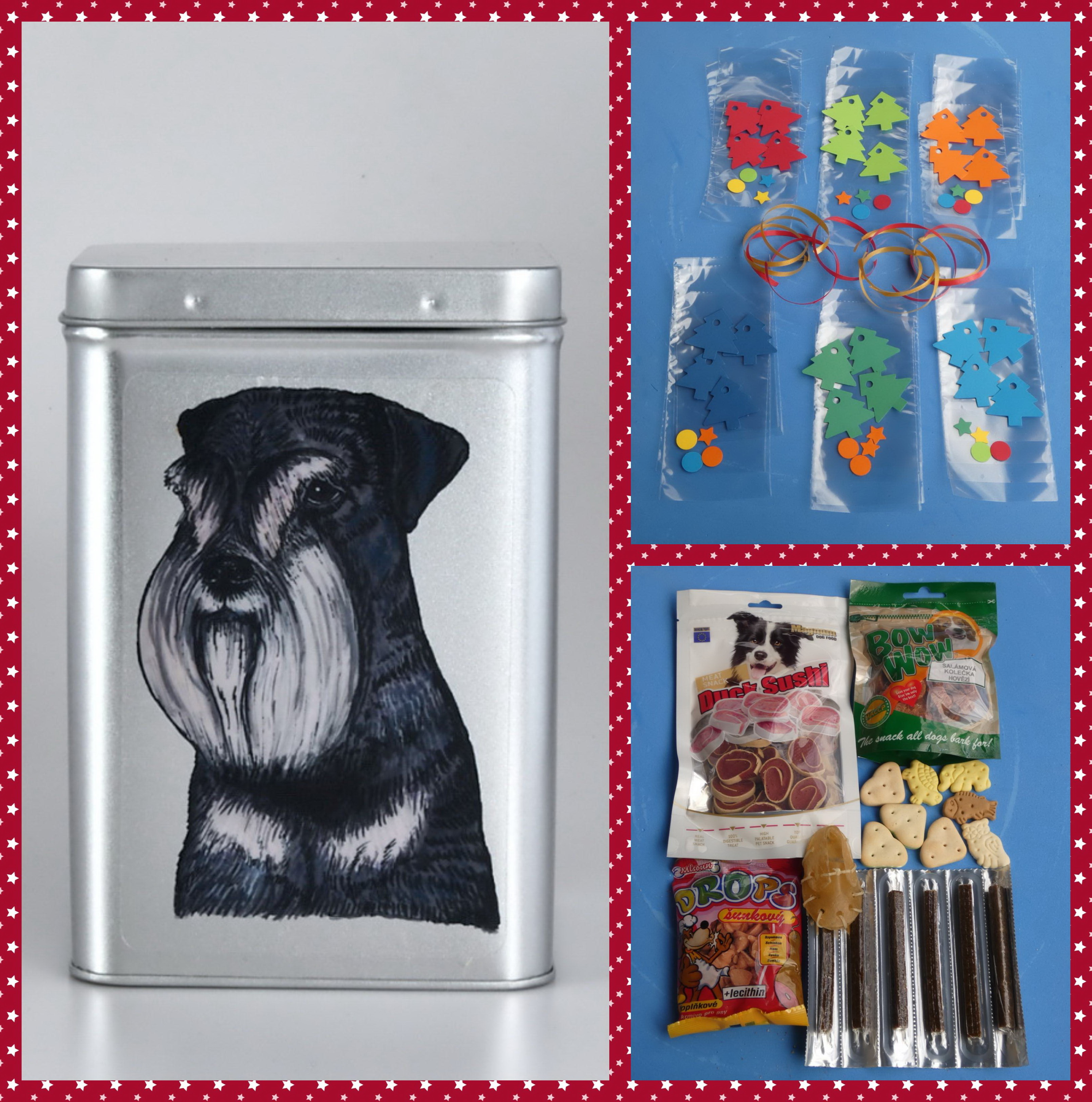 DIY - vyrobte si sami netradiční adventní kalendář pro pejsky z dodaných pamlsků, sáčků, stuh a papírových stromečků. Vše pak můžete uložit do dózy stříbrné barvy s víčkem na pantíky a s barevnou perokresbou psa plemene malý knírač (Schnauzer).