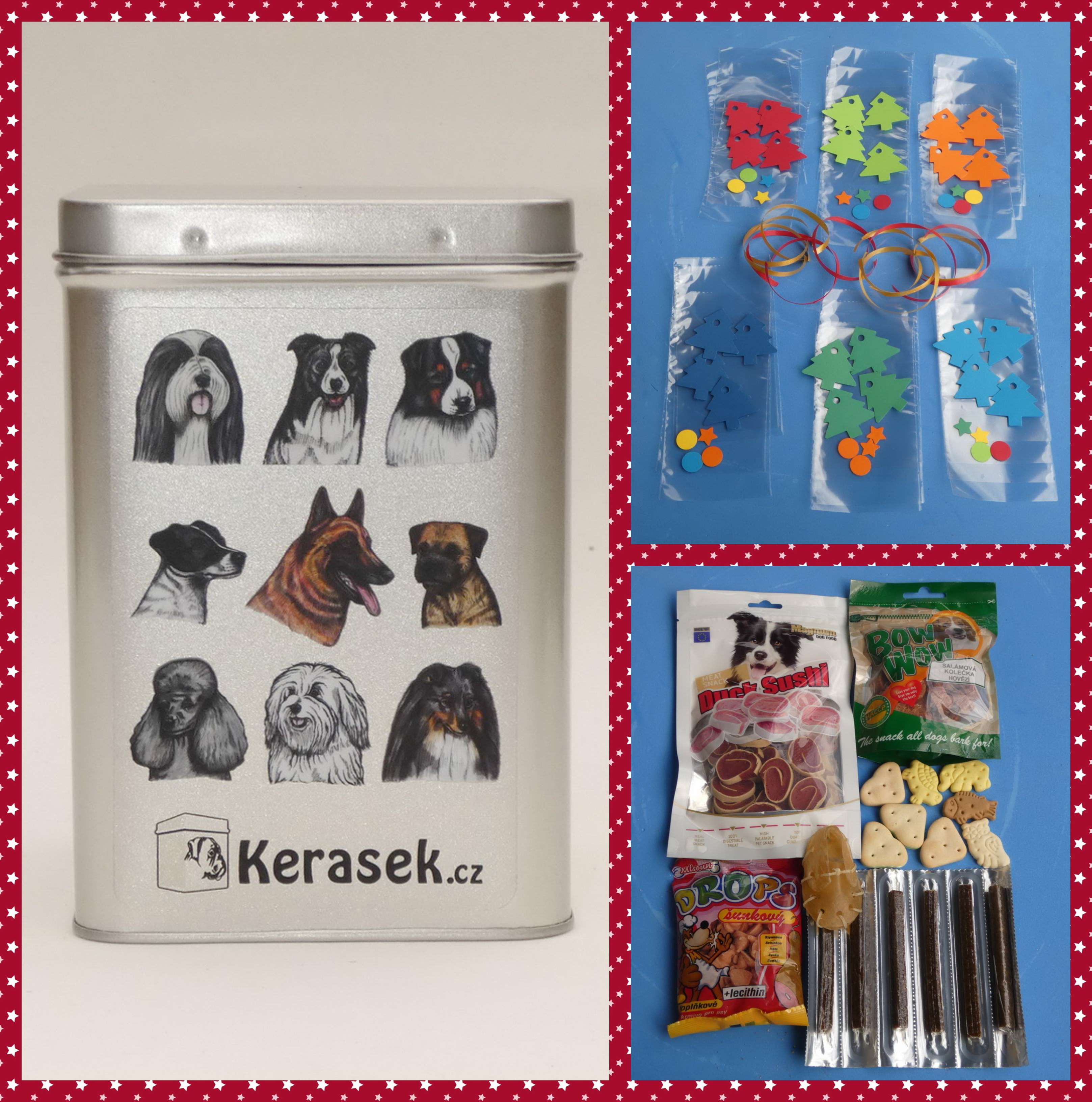 DIY - vyrobte si sami netradiční adventní kalendář pro pejsky z dodaných pamlsků, sáčků, stuh a papírových stromečků. Vše pak můžete uložit do dózy stříbrné barvy s víčkem na pantíky a s barevnou perokresbou 9 plemen psů běhajících agility- bearded kolie, border kolie, belgický ovčák-malinois, australský ovčák, Jack Russel terér, border teriér, pudl, šeltie, cotonek.