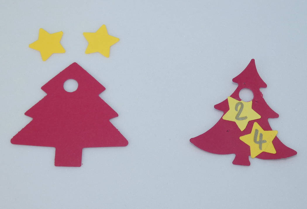 - nalepte kolečka a hvězdičky na papírové stromečky - hvězdičky jsou pro čísla 1-9 a 24, kolečka jsou pro čísla 10-23