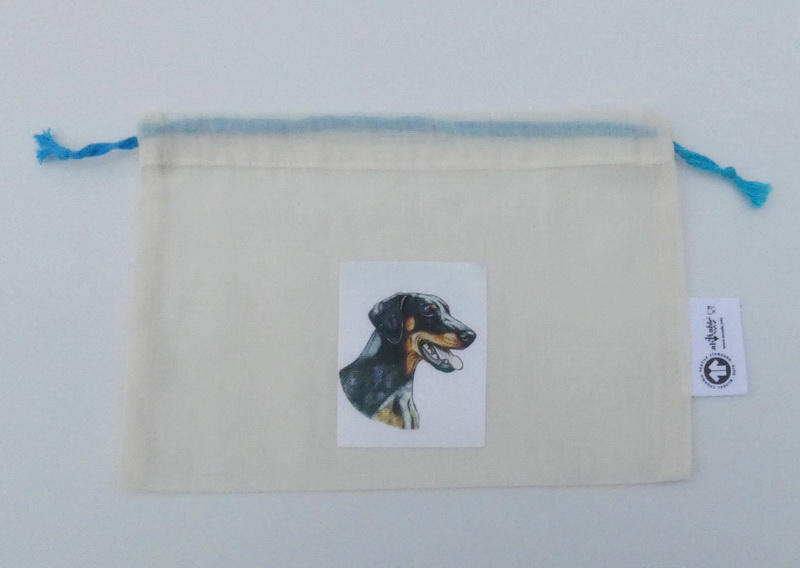 Sáček z biobavlny lehce krémové barvy o velikosti 16 x 16 cm s nosností až 0,5 kg a s textilní nažehlenou etiketou s potiskem dobrmana* (velikost etikety 5 x 7 cm). Sáčky se vyrábí v malé dílně v Indii, splňují certifikaci GOTS od Ecocert Greenlife (více na www.ecocert.com). Licence č. 122176 - ECODIS. Jsou prodyšné, průsvitné, ideální na potraviny, pamlsky. Pratelné do 40°C otočené naruby, ideálně však v ruce. Sáček lze stáhnout bavlněnou šńůrkou (zelená, modrá,oranžová, hnědá), dodání v konkrétní barvě nelze ovlivnit. Dodáváme dle skladových zásob.