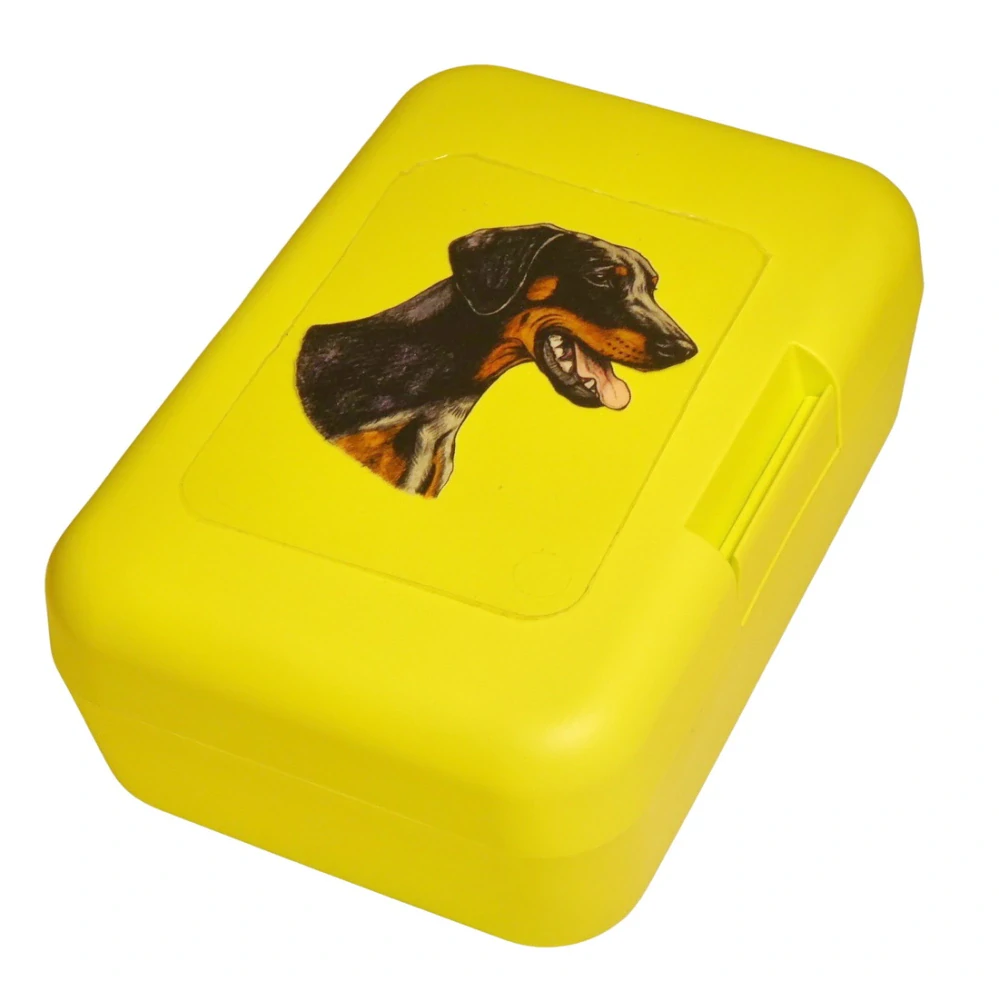 Plastový svačinový box s barevným potiskem dobrmana. Vhodný k uložení nejen klasické svačiny, ale i dalších potravin jako např. sušeného ovoce a oříšků, sušenek a jiných dobrot. Svou velikostí je velmi vhodný dětem do školních aktovek a batohů, do školy i na výlety.
