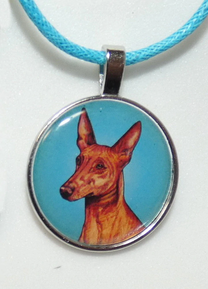 Barevná perokresba psa plemene faraonský pes s barevným pozadím je na bižuterním lůžku chráněna 3D epoxy pryskyřicí, která je nerozbitná a lehce pruží.