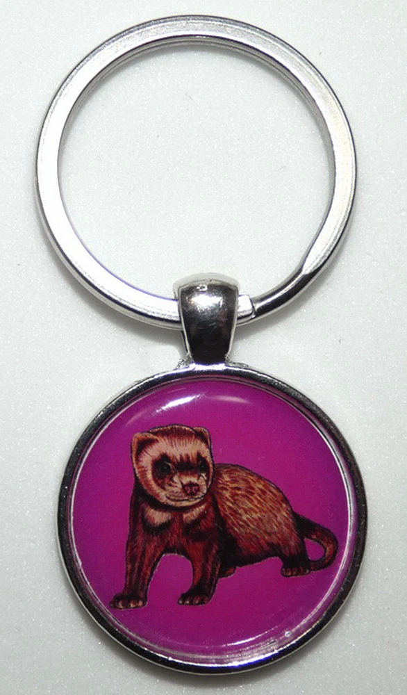 Perokresba fretky s barevným pozadím je na bižuterním lůžku chráněna 3D epoxy pryskyřicí, která je nerozbitná a lehce pruží.