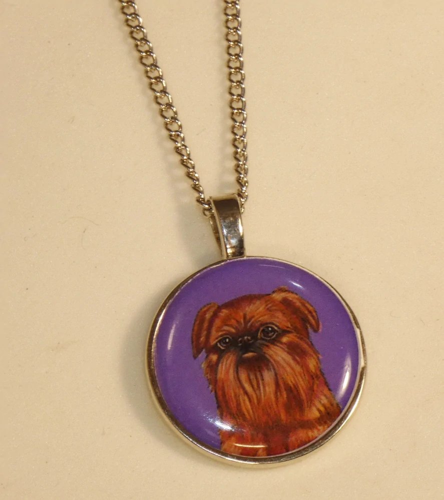 Barevná perokresba belgického, bruselského či brabantského grifonka s barevným pozadím je na bižuterním lůžku chráněna 3D epoxy pryskyřicí, která je nerozbitná a lehce pruží.  Přívěsek má průměr 25 mm a lze jej nosit standartně na krku, nebo také zavěšený na mobilu, kabelce, batohu, peněžence či klí... celý popis