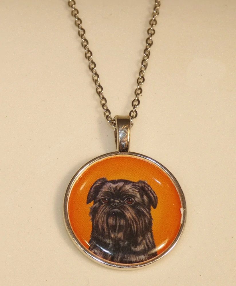 Barevná perokresba belgického, bruselského či brabantského grifonka s barevným pozadím je na bižuterním lůžku chráněna 3D epoxy pryskyřicí, která je nerozbitná a lehce pruží.  Přívěsek má průměr 25 mm a lze jej nosit standartně na krku, nebo také zavěšený na mobilu, kabelce, batohu, peněžence či klí... celý popis