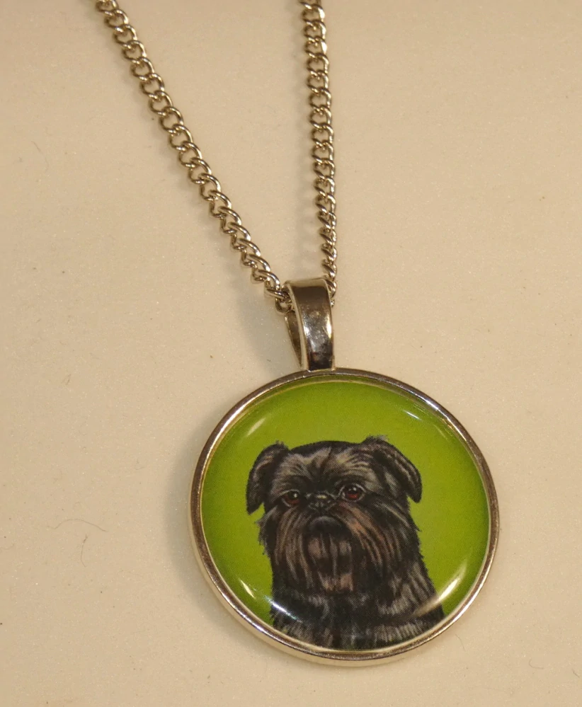 Barevná perokresba belgického, bruselského či brabantského grifonka s barevným pozadím je na bižuterním lůžku chráněna 3D epoxy pryskyřicí, která je nerozbitná a lehce pruží.