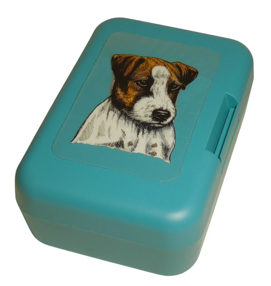 Plastový svačinový box s potiskem psa plemene Jack Russel teriér (JRT) s hrubou srstí. Boxík je vhodný k uložení nejen klasické svačiny, ale i dalších potravin jako např. sušeného ovoce a oříšků, sušenek a jiných dobrot. Svou velikostí je velmi vhodný dětem do školních aktovek a batohů, do školy i na výlety.