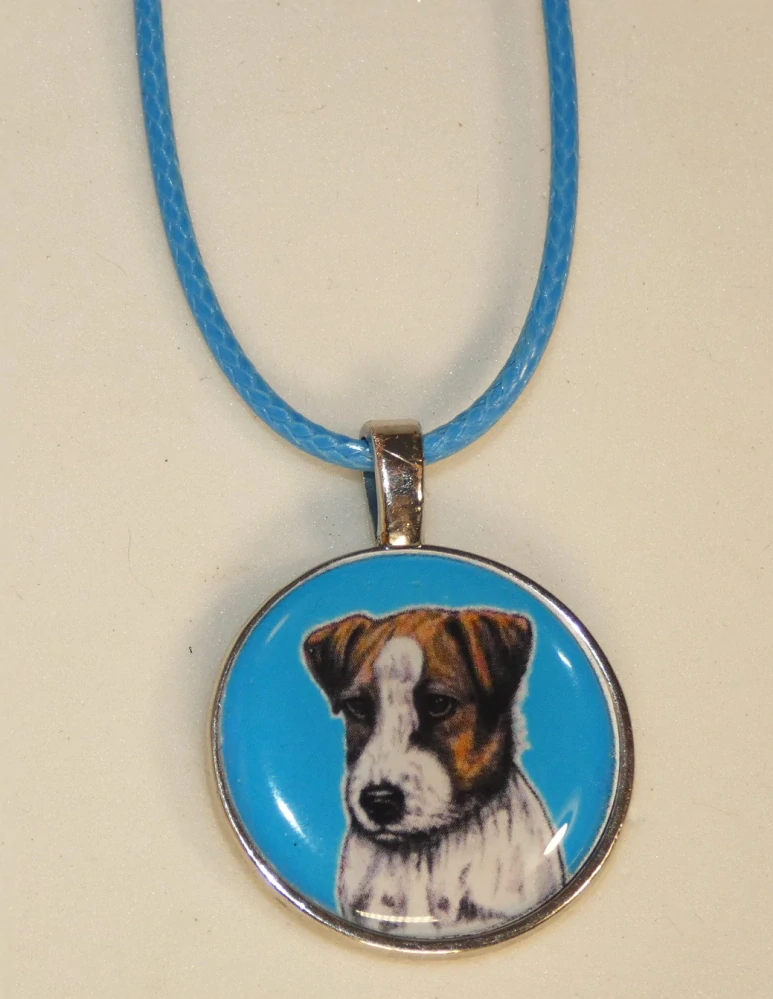 Barevná perokresba Jack Russel teriéra s barevným pozadím je na bižuterním lůžku chráněna 3D epoxy pryskyřicí, která je nerozbitná a lehce pruží.